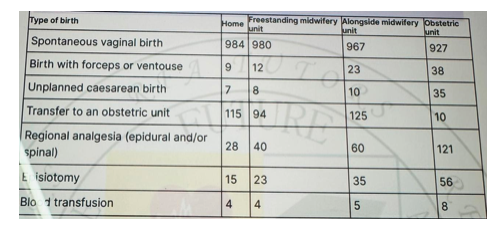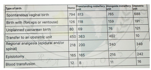 * Using tables 4 and 5, explain to low-risk nulliparous women that: planning birth at home or in a freestanding midwifery unit is associated with a higher rate of spontaneous vaginal birth than planning birth in an alongside midwifery unit, and these 3 settings are associated with higher rates of spontaneous vaginal birth than planning birth in an obstetric unit