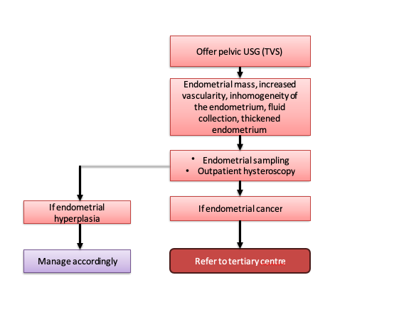 - Tamoxifen users: Higher risk → Consider direct biopsy or hysteroscopy even if endometrium thin.