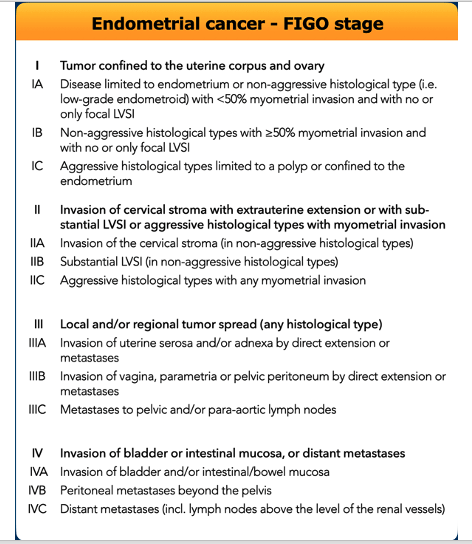 - Low Risk: Tumor size <2 cm; G1, G2 endometrioid adenocarcinoma; No or <50% myometrial invasion