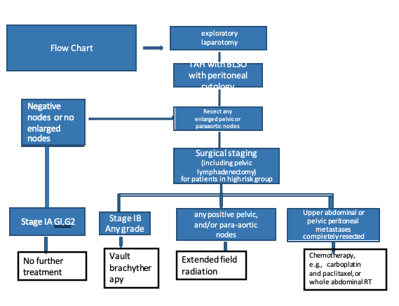 - Midline incision, remove tubes & ovaries, assess tumor size, MI, cervical extension, appropriate staging, HPE in tertiary center